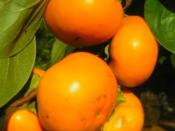 Non-astringent; hardy, semi-dwarf producing large, flat, orange-red sweet fruit